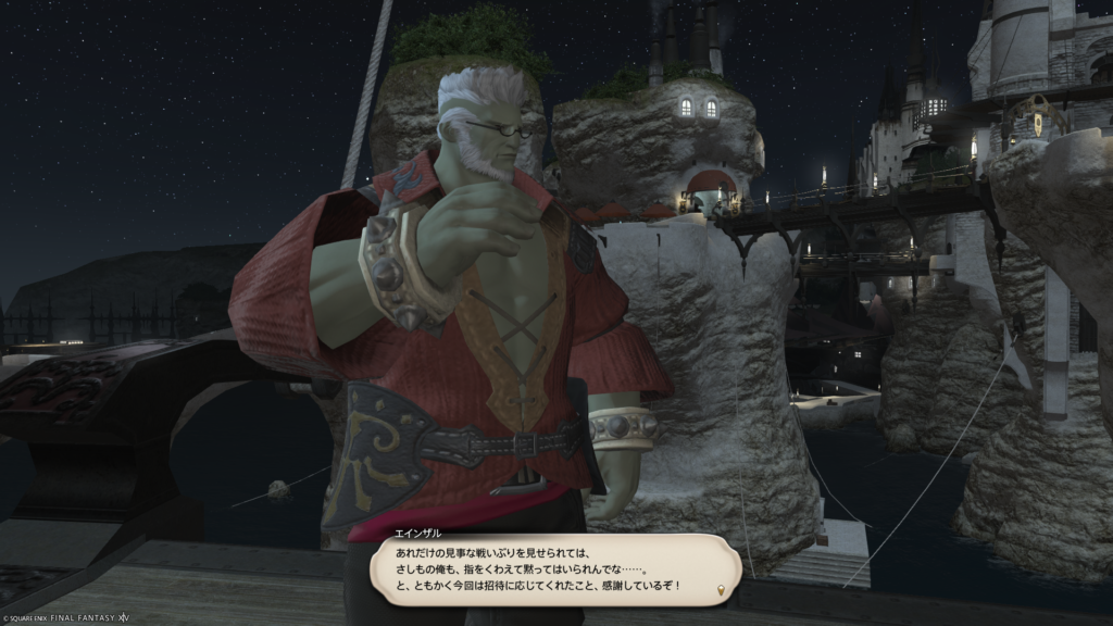 ボス3 エインザル・スラフィルシン大甲将:この方、かっこよくて好きなNPCの一人であります。とにかく時間がかかるのでMP管理に注意。樽はロブで外周へ移動させること。他の大技は防御バフ合わせで乗り切れます。